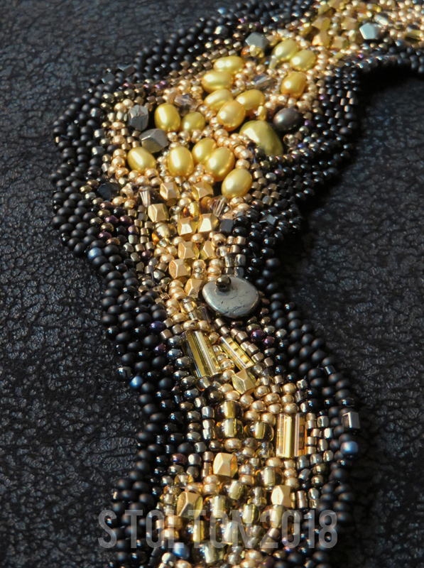 “Fortune’s Vein”. Glass, pyrite, freshwater pearl and brass beads on vegan leather.